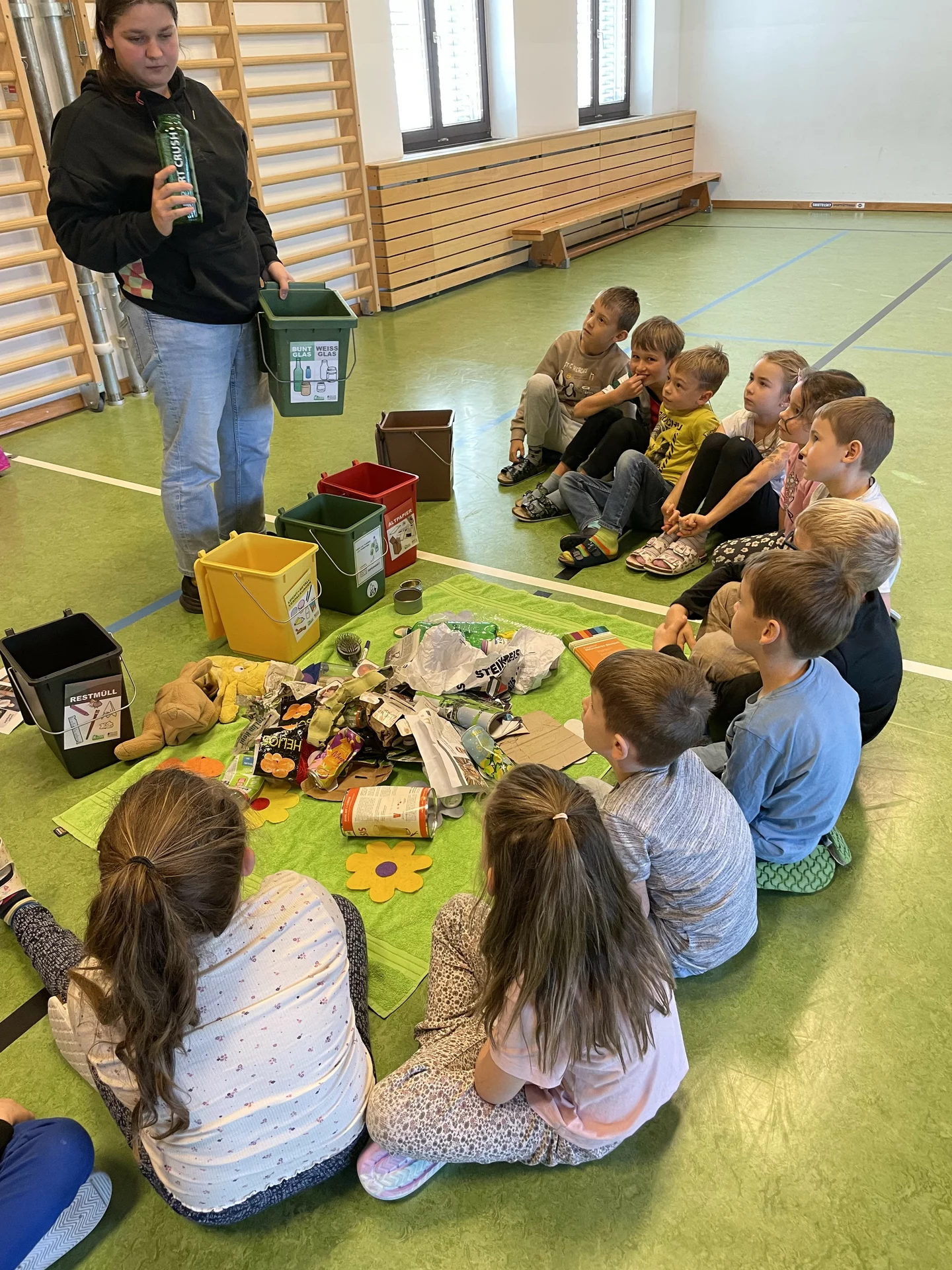 In einem spannenden Workshop zum Thema Mülltrennung erfuhren die Kinder, wie man Abfälle richtig sortiert und warum Recycling so wichtig ist. Mit anschaulichen Beispielen und praktischen Übungen zeigte ihnen Miriam Burger, wie wir alle im Alltag einen Beitrag zum Umweltschutz leisten können. Die Kinder waren mit großem Interesse dabei und konnten viel Neues mitnehmen. Vielleicht werden sie in nächster Zeit auch ihre Eltern diesbezüglich "schulen".