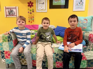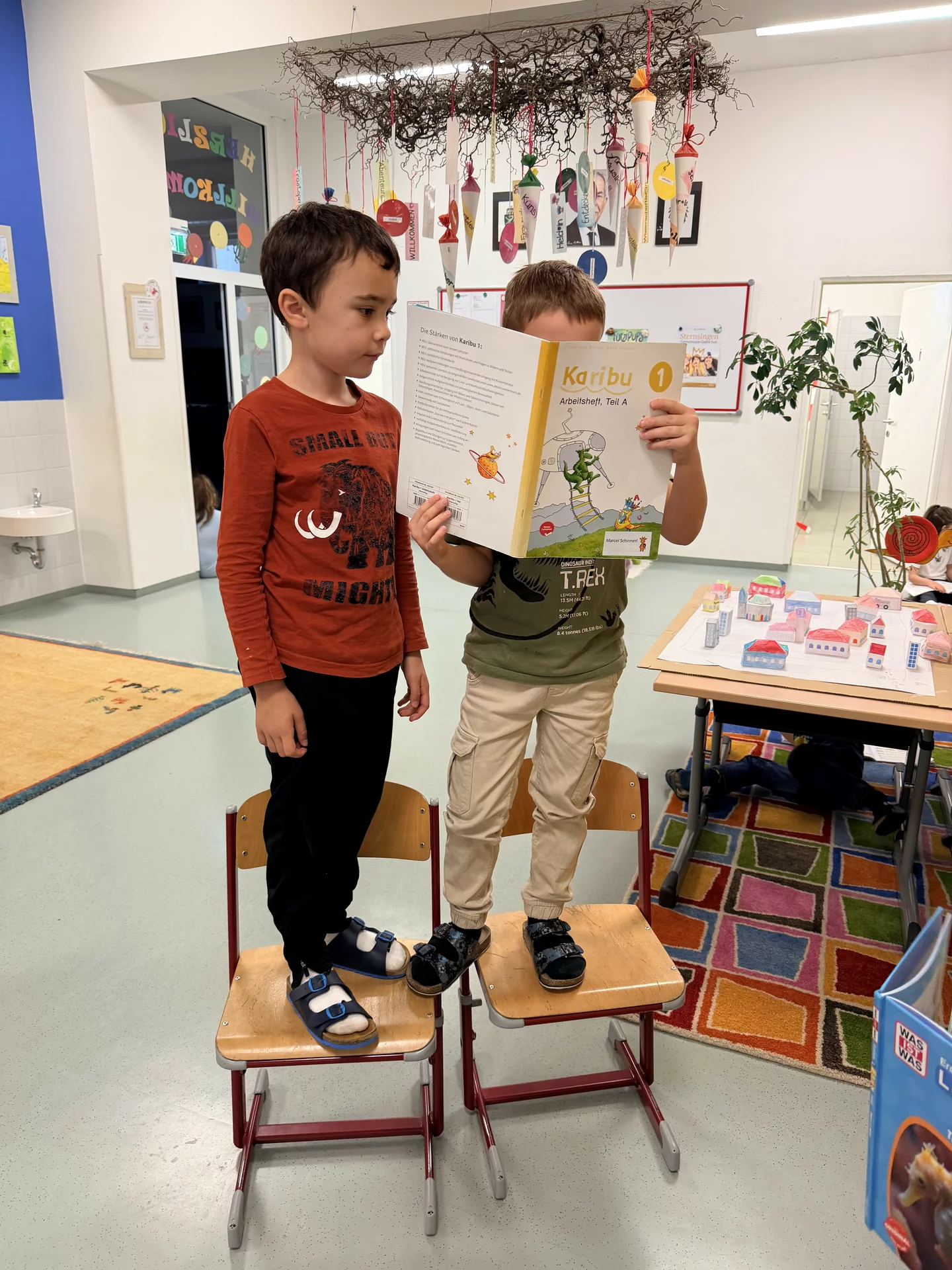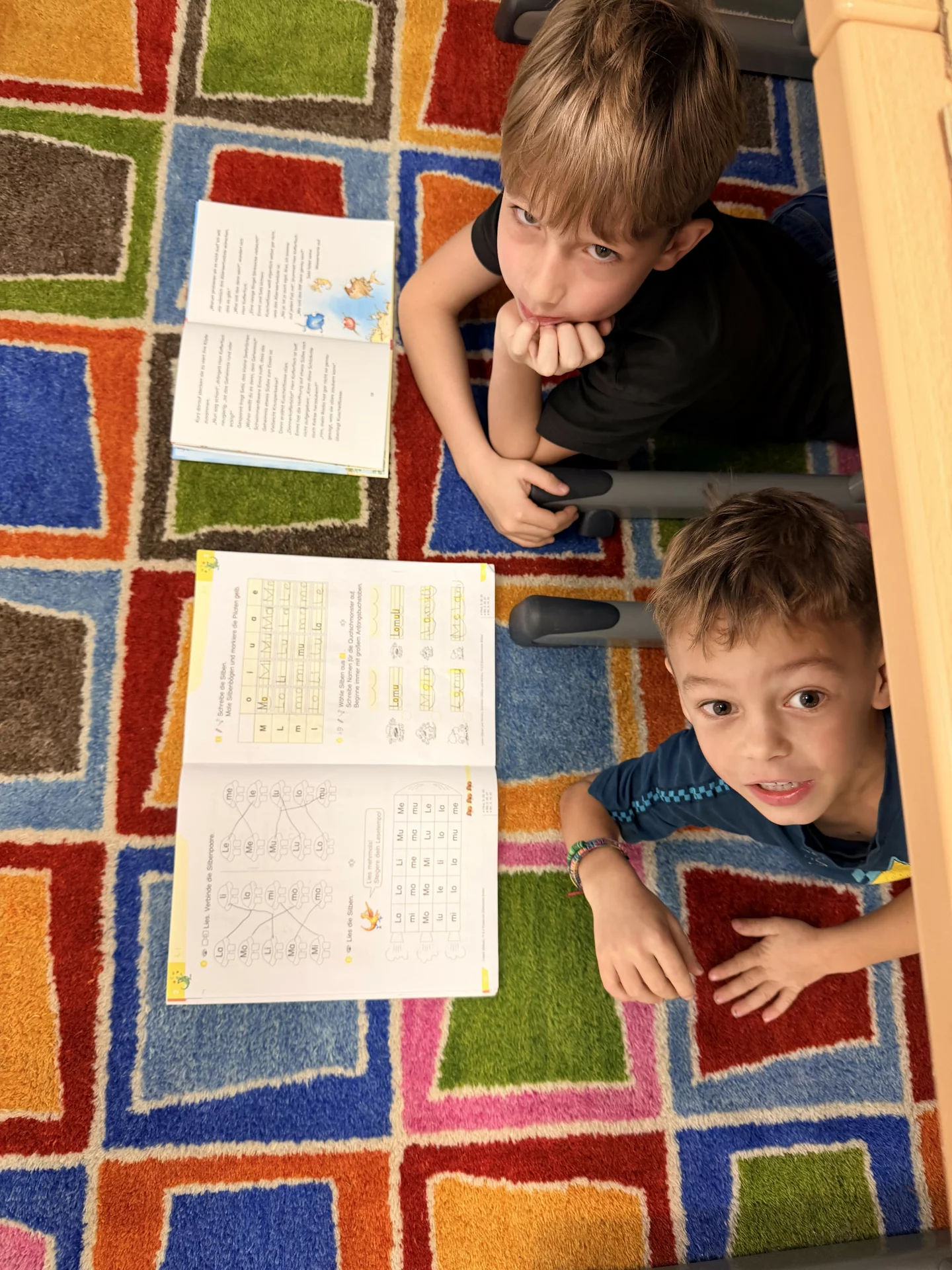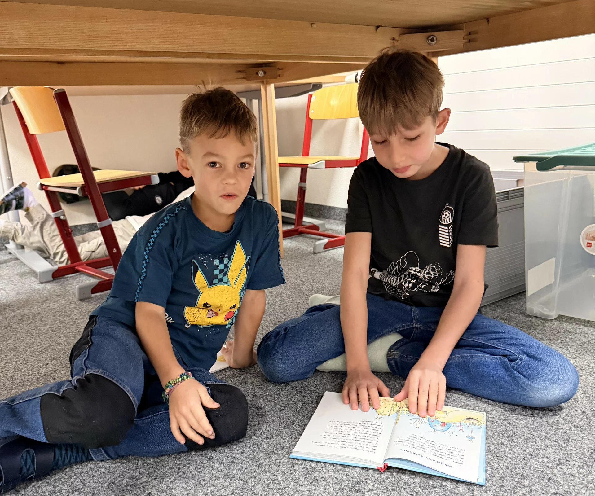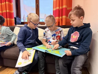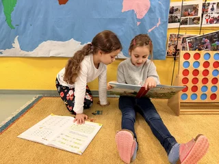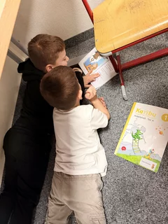 Kinder der 2. Klasse lesen den Leseanfänger:innen der 1. Klasse aus Büchern vor. Den "Großen" gefällt es, weil sie zeigen können, wie gut sie schon lesen können. Und die "Kleinen" genießen die tollen Geschichten, die sie hören. So ist das immer tatsächlich ein LeseFEST. Gelesen wir nicht nur brav an Tischen sitzend, sondern auch entspannt auf dem Teppich liegend oder auf Sesseln stehend oder unter einem Tisch versteckt. Lesen ist IMMER lustig.